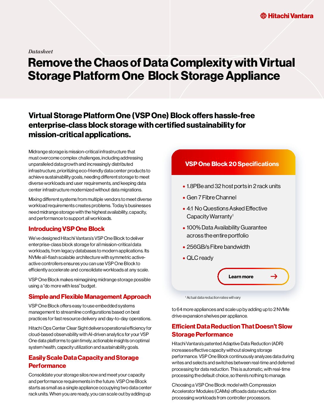 Hitachi Vantara’s VSP One Block delivers enterprise-class block storage for all mission-critical data workloads, from legacy databases to modern applications. Its NVMe all-flash scalable architecture with symmetric active-active controllers ensures you can use VSP One Block to efficiently accelerate and consolidate workloads at any scale.  Read the datasheet for product specifications and specific features.